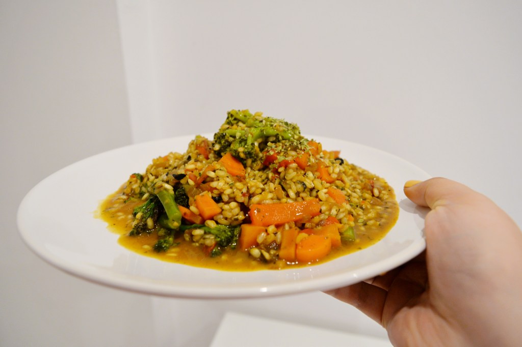 Last week I went to a cute bulk store that sold brown arborio rice with different mixes of dehydrated vegetables already incorporated. These vegetables, along with the fresh vegetables that I added, offer a beautiful array of colors, perhaps akin to the splashes of color in a Murano vase or sculpture. These colors might have included yellow too, but the saffron packets that I added were unfortunately so under-filled that its color was overpowered by the broth.