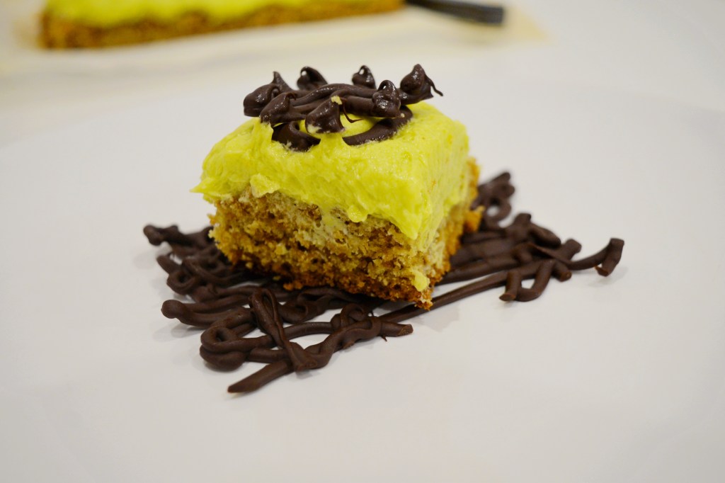 - When cake is cooled, shave off top and sides to expose the beautiful olive color within.