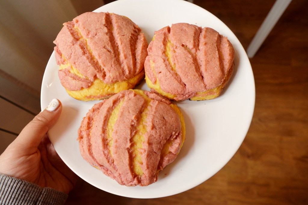 Just like the “pillowes of feathers” that Clare permits in the case that a sister is sick, the conchas that I made this week are light and fluffy. I had neither the mixer nor the concha cutter that the original recipe asked for (nor the two mixing bowls to be honest, so I had to briefly use a saucepan), but after two rises I don’t think it made much of a difference.