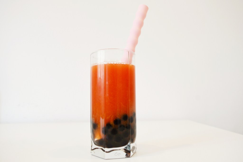 - Spoon about an inch of boba into your glass. Strain and add watermelon juice. Fill the remainder of the glass with orange juice.