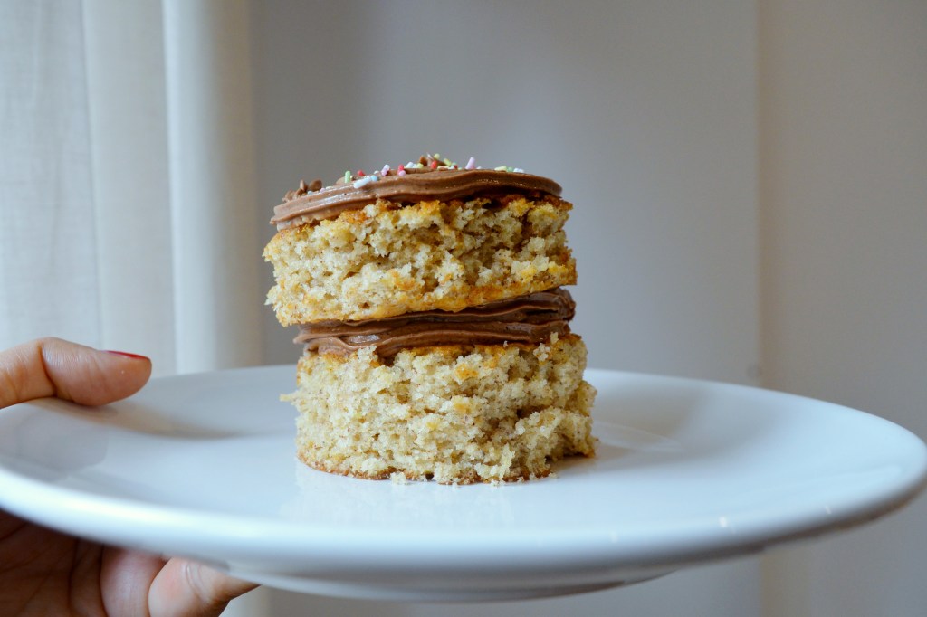 - For each mini cake, adhere one circle to some parchment paper or a cake base with a tiny bit of frosting. Pipe a ring of frosting on top, and fill the middle with chocolate hazelnut spread. Add a second circle on top. Pipe frosting all across the top, and add sprinkles. Leftover cake scraps and frosting can be used to make cake pops!