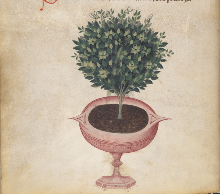 A basil plant that looks much like a decorative bush than any basil I’ve ever seen, with a pot whose angle pretty perfectly encapsulates the late-medieval urge to capture the 3D but refusing to use perspective:
