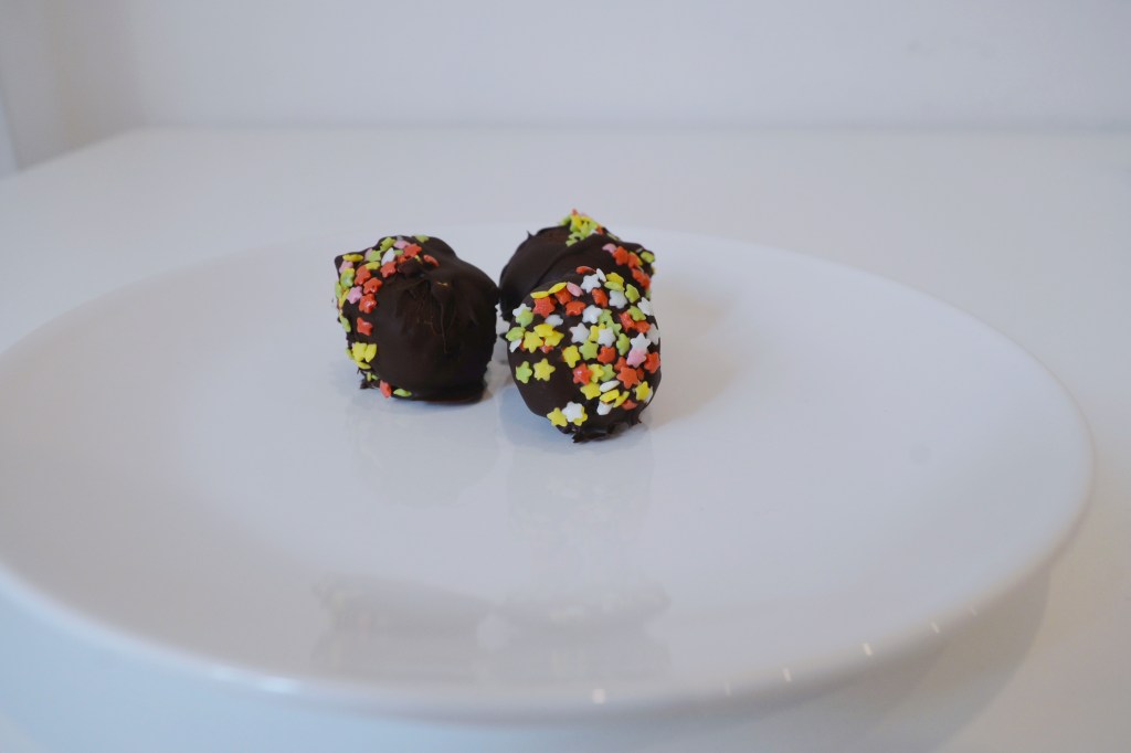 - Remove cake balls from the freezer, and work quickly, coating each with chocolate and tapping each into the pile of sprinkles before re-placing it on the parchment paper.